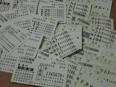 | そんな訳で久々の旅打ちでした。 競輪の結果は・・・ 聞かないで下さいorz そして。 今回の紙くずたち・・・ |