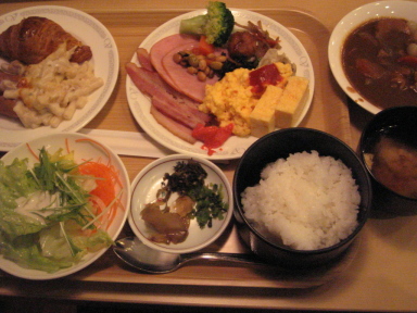 | 朝食バイキング。 バイキングが10時までなのが嬉しい。 (ちなみにチェックアウトは12時) 皿いっぱいにポテトを山積みしていた外人には驚いた。 |